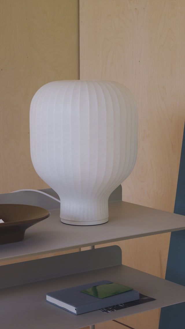 The Strand Table Lamp references design history while remaining distinctly modern. Its shape is soft and playful, a sculptural design fitted with a hidden light source that illuminates the whole of its monolithic form. The lamp is made in a sprayed cocoon material that consists of tiny strands for a complex, intriguing structure that gives the Strand Table Lamp an almost cloud-like appearance. Filtering light through for a warm, comfortable glow, it brings a sense of comfort, harmony and a refined sensitivity to any room.