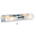 2 light designer bathroom wall fitting in chrome with opal glass and pull cord switch. Height: 65mm, Width: 350mm, Projection: 100mm. Requires 2x 40W G9 Capsule lamps. Lamps not included! IP44 rated, suitable for bathroom zones 1, 2 and outside zones.