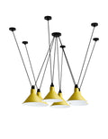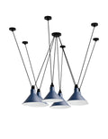 Pendant lamps in cast aluminium and textile cables. Les Acrobates de Gras perform various figures in the air, perched at a height of several metres. The spectacle is bold: in movement, rhythm and colour. The colours and shapes of the Gras reflectors and glass balls (sizes L, XL, Ø175 and Ø250) offer a dynamic and elegant display. Les Acrobates de Gras can be linked together. Each one can perform its number!
