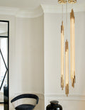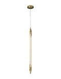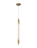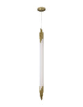 Horizontal pendant lamp in anodised aluminium (gold finish) and opaline glass. The designer Sebastian Summa was inspired by science fiction and astronomy to create a lamp like a shooting star. Available in 3 sizes, and also as a vertical pendant.