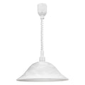 This pendant luminaire from the series ALESSANDRA is made of white plastic and white alabaster glass. It is height-adjustable and has protective insulation. The spotlight needs an E27-lamp.The luminaires from the series ALESSANDRA made of white or brown alabaster glass and plastic are the ideal illumination for your kitchen table.
