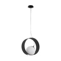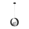 This luminaire of the CAMARGO series is made of black structured powder-coated steel und white satin opal glass. It needs an E27-illuminant to shine.The luminaires of the CAMARGO series impress with their black metal ring and the light ball placed inside, which provides 360 degree illumination.
