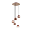 This pendant luminaire of the ROCAMAR 1 series is made of steel with a copper galvanized surface and clear glass. It needs five E27-illuminants to shine.The luminaires of the ROCAMAR & ROCAMAR 1 series fit over any table and provide a great ambience in your home.