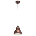 This pendant luminaire from the series TRURO is made of antique-copper-coloured steel. It has protective insulation and needs an E27-lamp to shine.The luminaires from the series TRURO are deliberately designed to look imperfect with the irregular surfaces of their metal hoods.