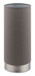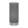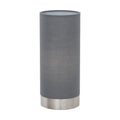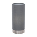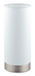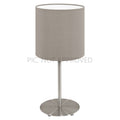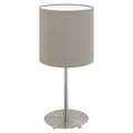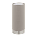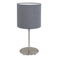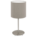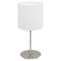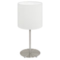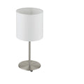 This table luminaire from the series PASTERI is made of satin nickel steel and fabric in white. It is operated by a cable switch, has protective insulation and needs an E27-lamp to shine.Steel and fabric shades in many different colours are processed into luminaires in many different shapes and types for the series PASTERI.