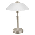This table luminaire from the series SOLO 1 is made of satin nickel steel and white satinized glass. It has protective insulation and needs an E14-lamp to shine. It can be switched on/off and dimmed by touching the specially designed “Touch Me“ part of thThe luminaires from the series SOLO 1 appear elegant with their small shades of white satinized glass and become your companion for comfortable evening hours.