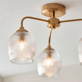 Features & Benefits: Brushed aged brass plated metal work. Fluted clear glass shades. Ideal for low ceilings. Dimmable. Twin with E14 LED filament lamps for that unique 'on trend' look