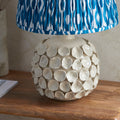 Inspired by nature, this hand decorated sculptured ceramic table light is finished in a gloss vintage white crackle glaze; with a switched brass B22 lamp holder and natural colour braided flex. Paired with our vibrant marlin blue 35cm Ikat shade for the perfect interior addition.