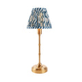 Features & Benefits: Fully portable USB rechargeable table lamp. Brushed aged brass plated finish. Handmade gathered pleated tapered shade. Digitally printed marlin blue faux linen fabric. Taped edge detailing with plain inner lining. 1.5W Integrated LED 2700K warm white. 3 stage touch dimmer - 40lm / 80lm / 155lm. 5.5 hours to full charge, producing up to 36 hours of light. Complete with USB-C to USB-A charging cable. Rechargeable battery included (3.7V 3600mA)