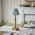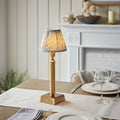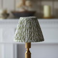 Features & Benefits: Fully portable USB rechargeable table lamp. Brushed aged brass plated finish with reeded stem detail. Handmade gathered pleated tapered shade. Digitally printed herb garden green faux linen fabric. Taped edge detailing with plain inner lining. 1.5W Integrated LED 2700K warm white. 3 stage touch dimmer - 40lm / 80lm / 155lm. 5.5 hours to full charge, producing up to 36 hours of light. Complete with USB-C to USB-A charging cable. Rechargeable battery included (3.7V 3600mA)