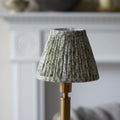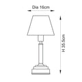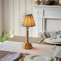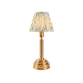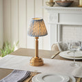 Features & Benefits: Fully portable USB rechargeable table lamp. Brushed aged brass plated finish. Handmade gathered pleated tapered shade. Digitally printed pearl grey faux linen fabric. Taped edge detailing with plain inner lining. 1.5W Integrated LED 2700K warm white. 3 stage touch dimmer - 40lm / 80lm / 155lm. 5.5 hours to full charge, producing up to 36 hours of light. Complete with USB-C to USB-A charging cable. Rechargeable battery included (3.7V 3600mA)