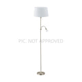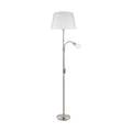 This floor luminaire from the series CONESA is made of satin nickel steel, white fabric and glass and is operated by a cable switch. It has protective insulation and needs an E27- and an E14-lamp to shine. The series CONESA convinces with the combination of fabric- and glass shade and its integrated reading luminaire.