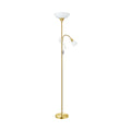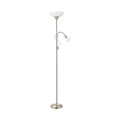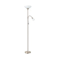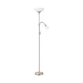 This floor luminaire from the series UP 2 with integrated reading luminaire is made of satin nickel steel, white glass and plastic and is operated by a cable switch. It has protective insulation and needs an E27- and an E14-lamp to shine.The luminaires from the series UP 2 are available in four different colours for individual use.