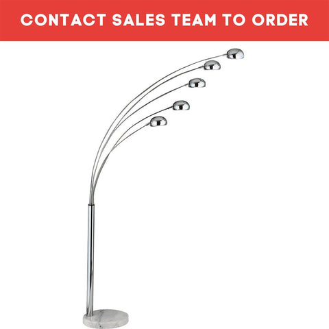 This Chrome Giraffe 5 light floor lamp is inspired by modern Italian design, with dome shaped, metal shades and stylish chrome finish. The marble base provides a solid foundation for the extravagant arc leading to the five chrome dome shades. The artistic elements provide an interesting focal point so you can transform any dull space into a light and attractive area
