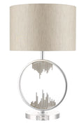 The Manhatten is an elegant sculpted table lamp in a polished chrome finish. The base of this contemporary lamp is round shaped adorned with a pipe like effect at the top and bottom of the circle in an attractive abstract effect resembling the Manhatten skyline. The eye catching base sits atop a luxurious crystal base and comes complete with a cotton cream linen effect drum shade with silver inner. The Manhatten is also available in Antique Brass.