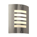 Modern, brushed stainless steel exterior wall bracket with an opal diffuser made from polycarbonate. This fitting is compatible with LED lamps and is IP44 rated.