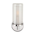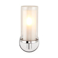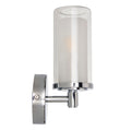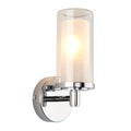 This bathroom wall light features a cylindrical double-glass shade, an inner frosted diffuser surrounded by a clear outer glass, creating a layered look that softens glare while still allowing the light to shine brightly. The polished chrome backplate and arm add a sleek, contemporary touch, making it ideal for modern bathrooms. The combination of frosted and clear glass provides both functional illumination and a stylish decorative element.