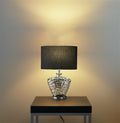 This striking table lamp features a unique cut out design. Contrasting against this, there is a chic black fabric shade which adds emphasise to the dramatic chrome body of the lamp. This item would perfectly compliment a sophisticated and contemporary styled home.