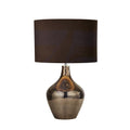 This table lamp features a smoked mosaic base and rounded brown suede shade. The table lamp can be added to a lounge, hallway or bedroom in a modern home.