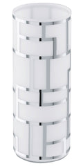 This table luminaire from the series BAYMAN is made of white and chrome-plated glass with special pattern. It is operated by a cable switch and has protective insulation. The spotlight needs an E27-lamp.The luminaires from the series BAYMAN convince with their unique graphic patterns on the lamp shades.