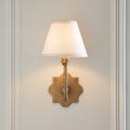 Add timeless character to your space with this single B22 wall light, featuring a beautifully sand-cast decorative backplate in a quatrefoil silhouette. The gently curved brass arm supports a classic tapered linen effect fabric shade, with contrast colour taped edge. Ideal for hallways, bedrooms, or living areas, this wall sconce blends traditional craftsmanship with understated sophistication.