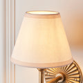 Features & Benefits: Hand crafted solid cast wall back. Brass patina finish. Handcrafted taped edge tapered shade. Vintage white cotton mix fabric. Almond white contrasting taped edge detail. Authentic brass B22 lamp holder. Dimmable. Compatible with B22 LED lamps. Arm and wall back requires assembly, fixing tool included