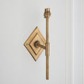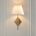 Bold yet refined, this single B22 wall light combines artisan craftsmanship with vibrant character. Its sand-cast decorative wall plate features a stepped diamond design, bringing textural interest and timeless appeal. Paired with a tapered vintage white pleated fabric shade with neutral colour taped edge, it adds a soft, inviting glow—perfect for hallways, bedside settings, or eclectic interiors seeking a touch of handcrafted elegance.