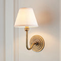 Features & Benefits: Hand crafted solid cast wall back. Brass patina finish. Handcrafted taped edge tapered shade. Vintage white cotton mix fabric. Almond white contrasting taped edge detail. Authentic brass B22 lamp holder. Dimmable. Compatible with B22 LED lamps. Arm and wall back requires assembly, fixing tool included