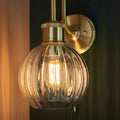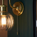 Features & Benefits: |Satin brass plated finish. Clear ribbed glass shade. Easy reach on/off pull switch. IP44 rated for safe bathroom use. Perfect for use with E27 LED lamps