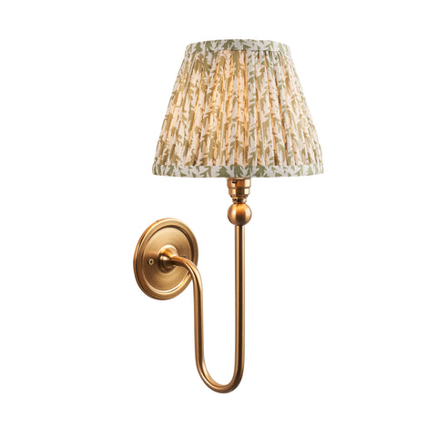 Features & Benefits: Brushed aged brass plated wall light. Handmade gathered pleated tapered shade. Digitally printed herb garden green faux linen fabric. Taped edge detailing with plain inner lining. Authentic brass B22 lamp holder. Dimmable. Compatible with B22 LED lamps