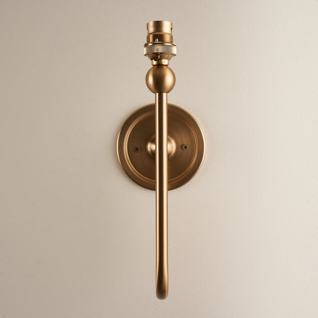 An elegant long line wall light with authentic B22 lamp holder and classic flat wall back, finished in brushed aged brass. Combined with a subtle herd garden green leaf 20cm fabric shade.