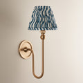 Features & Benefits: Brushed aged brass plated wall light. Handmade gathered pleated tapered shade. Digitally printed marlin blue faux linen fabric. Taped edge detailing with plain inner lining. Authentic brass B22 lamp holder. Dimmable. Compatible with B22 LED lamps