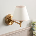 Features & Benefits: Brushed aged brass plated. Adjustable knuckle to angle arm to desired position. Authentic brass B22 lamp holder. Handcrafted taped edge tapered shade. Vintage white cotton mix fabric. Almond white contrasting taped edge detail. Dimmable. Compatible with B22 LED lamps. Arm and wall back requires assembly, fixing tool included