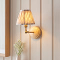 Features & Benefits: Natural Ash wood wall back. Brushed aged brass plated metalwork. Handmade gathered pleated tapered shade. Digitally printed neutral faux silk fabric. Taped edge detailing with plain inner lining. Authentic brass B22 lamp holder. Dimmable. Compatible with B22 LED lamps. Arm and wall back requires assembly, fixing tool included