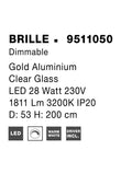 BRILLE Triac Dimmable Gold Aluminium & Acrylic LED 22 Watt 230 Volt 1811Lm 3200K IP20 D: 52 H: 200 cm Adjustable Height