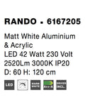 RANDO Matt White Aluminium & Acrylic LED 42 Watt 230 Volt 2520Lm 3000K IP20 D: 60 H: 120 cm