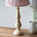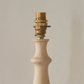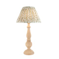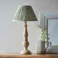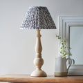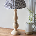 An elegant country classic style table light, hand turned in solid natural wood finish. With switched brass B22 lamp holder and grey braided fabric flex. Paired with our subtle pearl grey 30cm Leaf shade to complete the look.