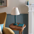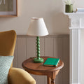Features & Benefits: Multiple stacked metal spheres table base. Gloss Cotswold green painted finish. Handcrafted taped edge tapered shade. Vintage white cotton mix fabric. Almond white contrasting taped edge detail. Inline on/off switch. 1.5 metre colour matching fabric flex. Compatible with E14 LED lamps