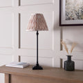 Features & Benefits: Matt black painted metal work. Handcrafted gathered pleated tapered shade. Digitally printed luxurious silk-like texture polyester-cotton blend fabric. Taped edge detailing with plain inner lining. Switched B22 metal lamp holder. 1.5 metre black fabric cable to plug. Perfect for use with B22 LED lamps