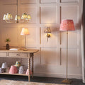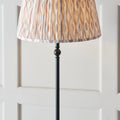 Features & Benefits: Matt black painted metal work. Handcrafted gathered pleated tapered shade. Digitally printed luxurious silk-like texture polyester-cotton blend fabric. Taped edge detailing with plain inner lining. Switched B22 metal lamp holder. 2 metre black fabric cable to plug. Perfect for use with B22 LED lamps