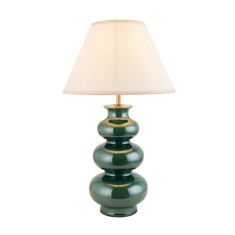 Features & Benefits: Hand crafted ceramic table lamp. Gloss green reactive glaze. Aged brass plated stem. Handcrafted taped edge tapered shade. Vintage white cotton mix fabric. Almond white contrasting taped edge detail. Switched B22 brass lamp holder. 1.5 metre silver grey fabric cable. Compatible with B22 LED lamps