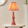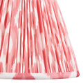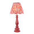 Features & Benefits: Gloss almond white colour resin table lamp. Handmade gathered pleated tapered shade. Digitally printed coral pink faux silk fabric. Taped edge detailing with plain inner lining. 1.5 metre white braided fabric cable. Compatible with B22 LED lamps