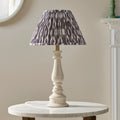 Features & Benefits: Gloss almond white colour resin table lamp. Switched B22 brass lamp holder. Handmade gathered pleated tapered shade. Digitally printed pearl grey faux silk fabric. Taped edge detailing with plain inner lining. 1.5 metre white braided fabric cable. Compatible with B22 LED lamps