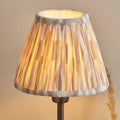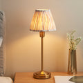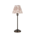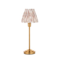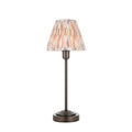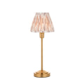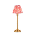 Features & Benefits: Timeless modern single table lamp base. Vintage brass plated finish. Handmade gathered pleated tapered shade. Digitally printed coral pink faux silk fabric. Taped edge detailing with plain inner lining. Inline on/off switch with 1.5 metre black cable. Compatible with E14 LED lamps