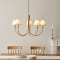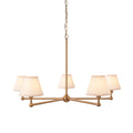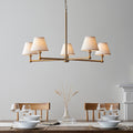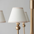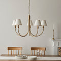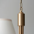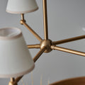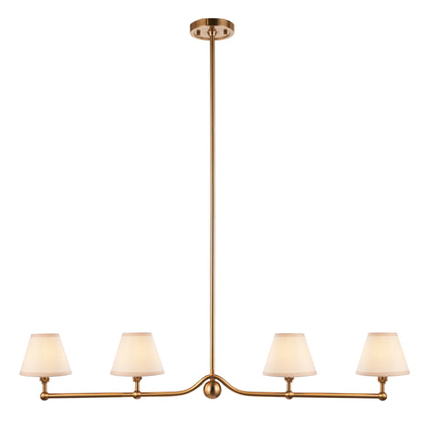 Features & Benefits: 4 light classic linear pendant. Brushed aged brass plated. Multi stem height options. Handcrafted taped edge tapered shade. Vintage white cotton mix fabric. Almond white contrasting taped edge detail. Authentic brass B22 lamp holders. Dimmable. Compatible with B22 LED lamps