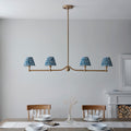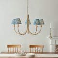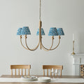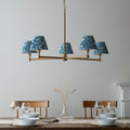 Features & Benefits: 4 light classic linear pendant. Brushed aged brass plated. Multi stem height options. Handmade gathered pleated tapered shade. Digitally printed marlin blue faux linen fabric. Taped edge detailing with plain inner lining. Authentic brass B22 lamp holders. Dimmable. Compatible with B22 LED lamps